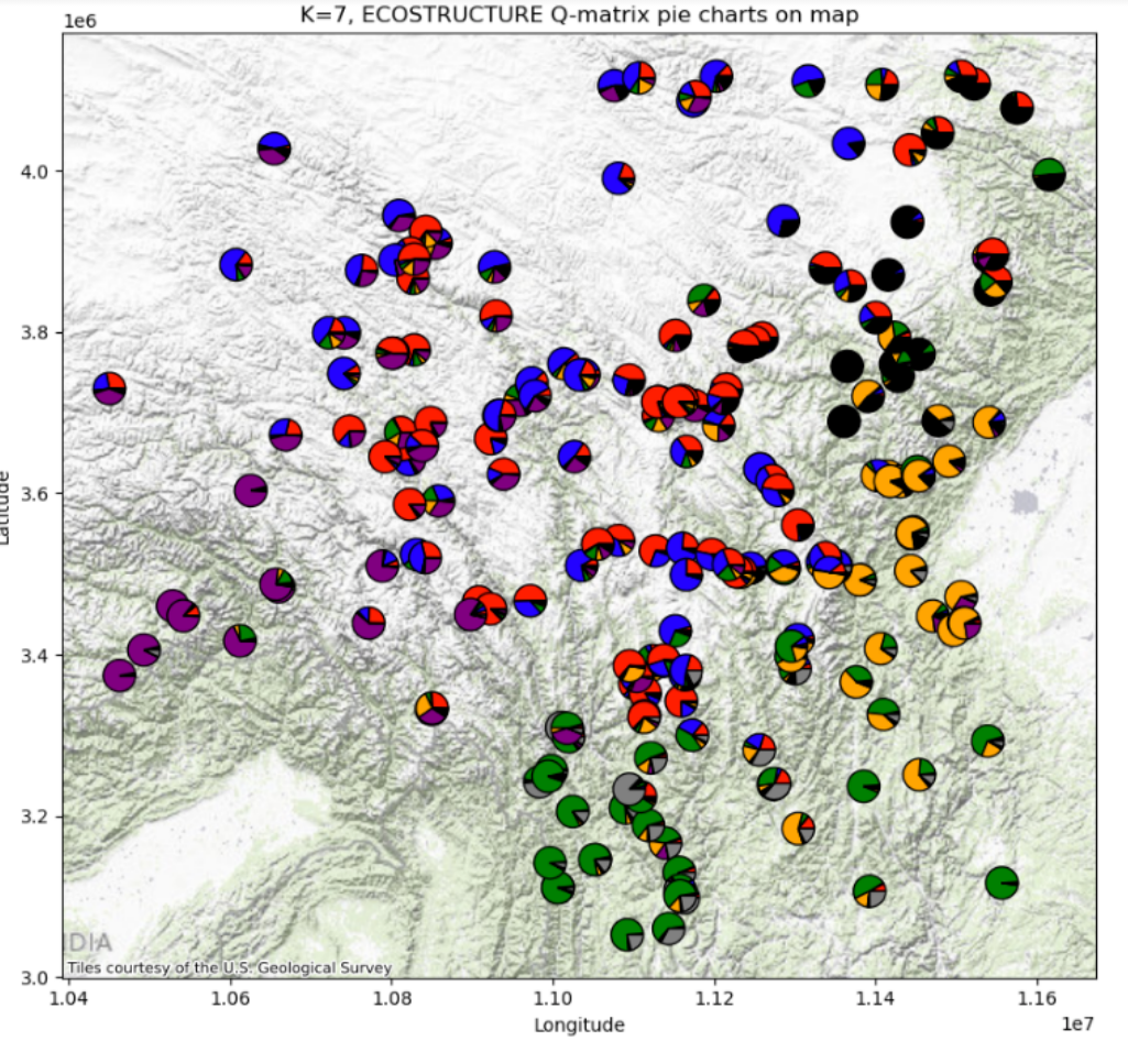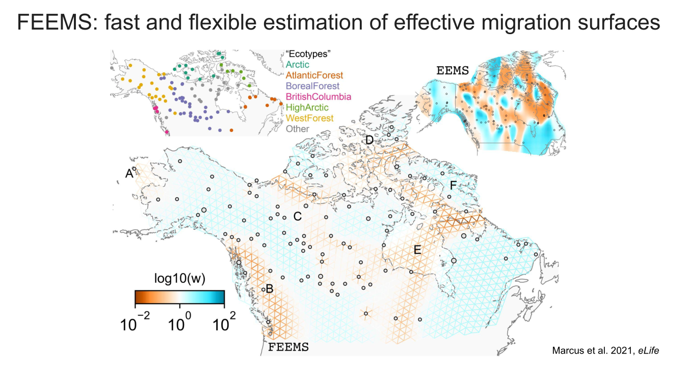 Using site-by-species matrix in place of site-by-allele matrix. High migration = low spp turnover across space; low migration = high spp turnover across space.