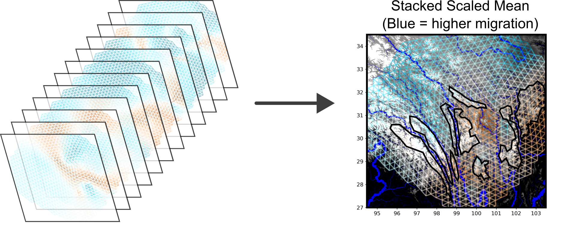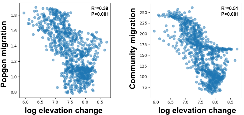 For paths of length=5 on graph: sum migration x sum change in elevation.