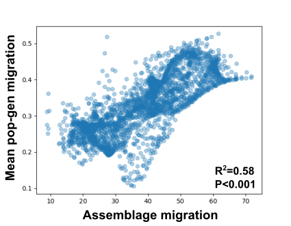Patterns are highly concordant (orange=both high or both low). Regions acting as barriers to species co-occurrence also act as barriers to gene flow, and vice-versa.